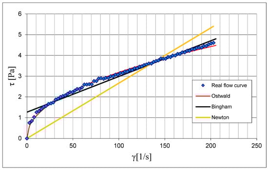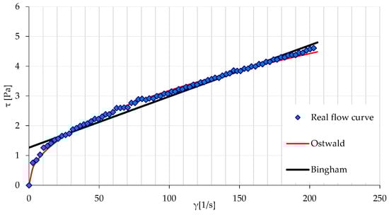 Three rheological models were selected to describe the measurement results (Figure 3). The Newton model did not describe the deformation of the tested medium with acceptable accuracy as the tested fluid did not meet the requirements for the Newton model, i.e., it was a non-Newtonian fluid. For the description, after rejecting the Newton model, the two most frequently used two-parameter models were selected, i.e., the Bingham model and the Ostwald de Waele model (Figure 4). The used models are the most common ones in the CFD software, which was the reason for choosing the formulas below.