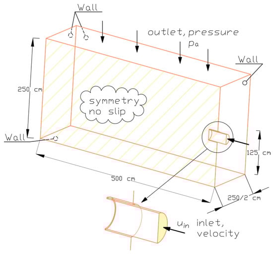 This research used the three-dimensional transient Eulerian model to simulate the flow of two gas–liquid phases in the Reynolds equations (Reynolds averaged Navier–Stokes—RANS). The equation system was closed with the standard k-ε turbulence model with standard functions for flow near the wall. The applied computational model enables defining the apparent viscosity for fluids. The fluid domain was discretized using a hexahedron mesh dominantly. The dimensions of the tank, and, in particular, the distance of the side walls from the inlet to the tank, were fitted to limit the impact of the walls on the fluid velocity distribution. The obtained y+ values for finite volumes in the wall layer in the range from 4.7 to 8.6 did not indicate the need to apply additional wall conditions. A 5 m long, 2.5 m deep and 2.5 m wide cuboidal tank was connected through the wall (dimensions 2.5 × 2.5 m) to a pipeline with a diameter of 250 mm and a length of 0.5 m, through which the digestate was introduced (Figure 5). The simulations included three inlet velocity uin of digestate added as the boundary condition, uniform on the surface of the inlet: 0.5, 1.0 and 1.5 m/s. The digestate was a continuous phase filling the whole tank. Initially, the digestate present in the tank was displaced with the incoming digestate, so that, in 20–30 s of simulation, the flow conditions were established. The excess fluid flowed freely through the upper boundary surface, with a given discharge condition to the atmosphere with standard sea-level conditions pa. Due to the symmetry of the geometry under study, calculations were performed on one half, taking into account the no-slip condition on the vertical division boundary.