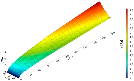 The tests were carried out in two campaigns (measurement and control), one day apart. In each campaign, 14 pseudo-flow curves were measured. The first sample measurement was taken at 30 °C, and each subsequent measurement at temperatures 2 degrees higher. The last measurement was taken at 56 °C—measurement no. 14. Then, the apparent deformation gradient was converted to the actual one. It was possible to present the results of each measurement campaign in the form of a solution plane, as presented in Figure 6. The plane describes the behavior of the test medium for three parameters: shear stress, actual deformation gradient and temperature.