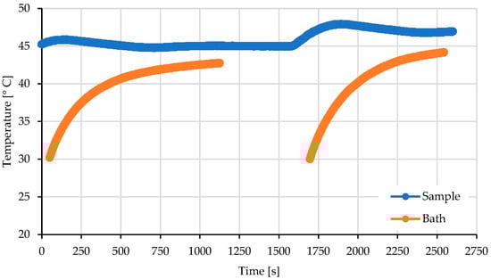 During the course of this research, a problem was encountered related to the correct determination of the temperature of the test sample. Figure 7 shows the temperature change in the sample and the circulating fluid in the thermostatic bath. The temperature of the circulating fluid in the thermostatic bath is marked in a blue solid line. The temperature was measured continuously as it was possible in the case of the used bath, and the measurement did not interfere with the course of the experiment. The temperature change during the heating of the sample until the expected value was reached is marked in red. The measurement was performed “in situ” in the measuring cylinder of the rheometer and, for the duration of the sample shear, the thermometer head was removed so as not to interfere with the flow of the sample in the gap of the rheometer set. As can be seen, there was a significant difference between the sample and fluid temperature—from 2.5 °C to 3.0 °C. This study followed the guidelines found in []. The heating time of a sample must not be too long, as the concentration of fluid changes during heating. The sample temperature was taken as the value of the sample temperature measured after its collection.