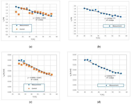 Graphs showing the fit of the models: linear (a,c) and exponential (b,d), describing the course of the rheological parameters of Bingham models: flow threshold and viscosity. Temperatures range from 30 °C to 56 °C.