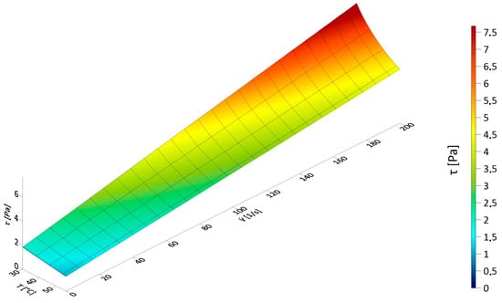 Then, the course of the flow threshold and viscosity values in the Bingham model were described by an exponential function (Figure 8c,d). The following parameter values were obtained: cBτo = 2.9729 and dBτo = −0.016; fit parameter values: R2 = 0.9582, MAE = 0.0304 Pa and MAPE = 2.015% for the flow threshold; cBh = 0.0658 and dBh = −0.025; and fit parameter values: R2 = 0.9805, MAE = 0.0007 N·s/m2 and MAPE = 2.973 for viscosity in the Bingham model (Table 4).