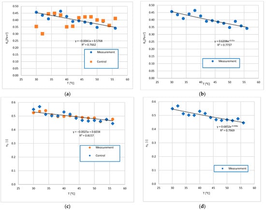 For measurement campaign 1 and control campaign 2, the change in rheological parameter values as a function of temperature was determined. The mathematically correct and relatively simple model describing the change in the rheological parameter as a function of temperature was then used to model the feedstock flow in the bioreactor for different liquid temperatures. The two simplest models, the linear model and the exponential model, were chosen to describe the correlation: