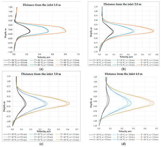 Changes in fluid velocity profiles in the tank at distances of (a) 1 m, (b) 2 m, (c) 3 m and (d) 4 m from the inlet cross-section in the performed simulations.