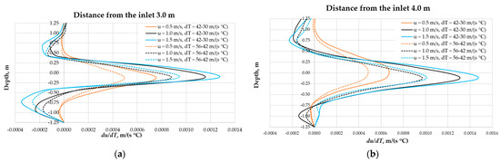 Changes in fluid flow velocity depending on the temperature in the tank at distances of (a) 3 m and (b) 4 m from the inlet cross-section in the performed simulations.