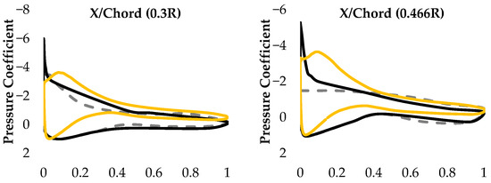 The velocity profiles as shown in Figure 7, Figure 8 and Figure 9 from a distance of 0.5 m appear to be in agreement with the pressure distribution results. At a 10 m/s inlet speed, the flow velocity appeared higher, particularly over the lower surfaces of the modified model, which decreased the pressure distribution considerably around this blade in comparison to the baseline model, thus generating a significantly slower flow over its lower surface in comparison to what the modified model generated. This explains the lower pressure distribution calculated over the lower surface of the original blade. The deviation in the velocity profiles of the two models, however, seemed to decrease during the 15 and 20 m/s inlet speed, as shown in Figure 8 and Figure 9. Here, the flow velocity over the lifting surface of the modified blade was somewhat higher than the original blade near the root of the blade. However, this velocity was almost the same near the tip, suggesting that shifting the location of the maximum thickness backward kept the flow attached to the lifting surface of the blade as the velocity and/or the AoA increased.