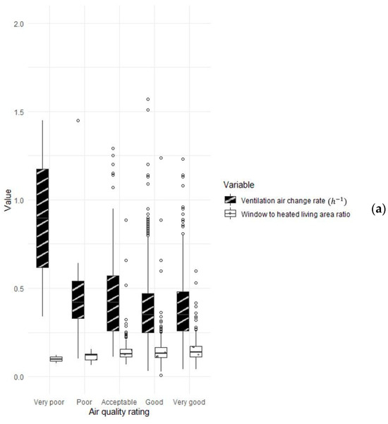 Figure 6a–c presents the boxplot diagrams of the building level ventilation air change rate (h−1), average indoor relative humidity (%), building living area (m2), and window to heated living area ratio for the five different perceived indoor air quality rating levels.