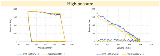 Figure 5 shows the working diagrams of the pump at 3000 RPM. The impact of fluids on the pump behavior resembles that observed at 1500 RPM, with the diagrams of the two HVO fuels superimposed, and the diesel diagram positioned between HVO and WCO. However, it is noteworthy that at 3000 RPM, the pump exhibits some irregularities towards the end of the intake phase. Upon closer inspection of the end of the suction phase (Figure 6), significant deviations in pressure trends are observed compared to the set admission pressure of 4 bar. The pressure peaks highlighted in Figure 6 (right) occur during the final stages of intake, when the volume of the working chamber is still increasing. In such instances, it is conceivable that these pressure peaks stem from communication with the delivery environment, possibly due to the imperfect sealing of the delivery valve or its oscillation/vibrations. This phenomenon is present across all three pressure levels and never appears at low speed.