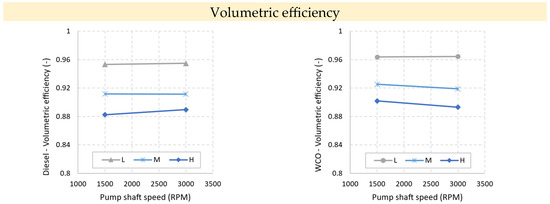 Figure 7 illustrates the trends in volumetric efficiency measured at each investigated operation point, highlighting the influence of the pressure level and pump shaft speed. Notably, as the pressure increases, there is a significant decrease in efficiency (the drop is in the order of seven percentage points from the lowest to highest pressure level). These findings align with the pressure–volume diagrams previously presented, underscoring that the pump fluid transfer capability primarily hinges on the compressibility modulus of the fluid. While the speed dependence is of secondary importance, it remains perceptible. Specifically, at high pressures, the volumetric efficiency of the pump operating with fluids characterized by lower viscosity (such as diesel, HVO 1, and HVO 2) tends to increase with speed. Conversely, when operating with WCO fluid, the pump tends to be penalized at high speeds, despite WCO consistently yielding the highest volumetric efficiency under all conditions. This observation suggests that when the pump speed increases, it does not necessarily result in a higher volumetric efficiency due to leakage reduction. Using fluids with relatively high viscosity, such as WCO, the increased speed leads to increased losses that affect the fluid transfer process.
