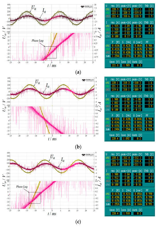 Meanwhile, the unity PF and low THD control for three-phase VSCs is achieved using the proposed method, where the average PF is 0.995 and the average THD is 4.7%, as shown in Figure 8c.