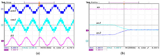 Figure 15 displays the experimental results of the three-level NPC controlled by the proposed SDSVM supplying a three-phase load. Figure 15a displays the modulated line-to-line voltages um1, the modulated line-to-neutral voltage vm1, and the load current iL1. Figure 15b shows the evolution of the DC link voltage us as well as voltages us1 and us2 across the upper and lower capacitors during the balancing procedure. It can be clearly seen that after time t1 (the beginning time of the balancing procedure execution), the voltages of both capacitors converged to an equal value after 400 ms. This is due to the capability of the proposed SDSVM to adhere to the redundant NPC converter switching states. The angles θ (between the um2-axis and the reference voltage vector umref) and θc (between the um2-axis and the new reference voltage vector umref_c) are shown in Figure 15c. In addition, Figure 15d shows the hexagon and the sector in which the voltage vector reference tip is located. It is clearly shown that hexagon H and sector S have a staircase shape and, therefore, the reference voltage vector will certainly sweep the six hexagons and the six sectors. Figure 15e illustrates the line-to-line output voltage together with its respective single-sided amplitude spectrum. Figure 15f shows the waveform of the line-to-line voltage, load current, and DC link voltage with a step change in the frequency (from 50 Hz to 100 Hz) of the voltage reference. This result confirms the validity of the SDSVM, even during a transient state.