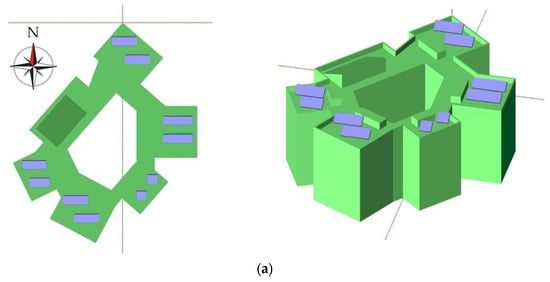 A 3D model of the building and its surroundings: (a) RTPV and (b) FAPV.