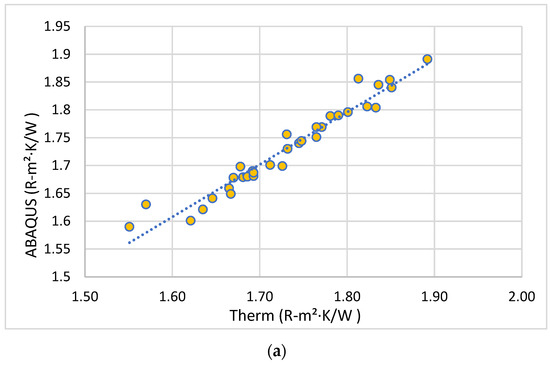 where and are the average surface heat fluxes through perforated and non-perforated studs (W/m2), respectively, extracted from steady-state FE simulations. The resistance of the steel conduction path was then corrected using Equation (19):