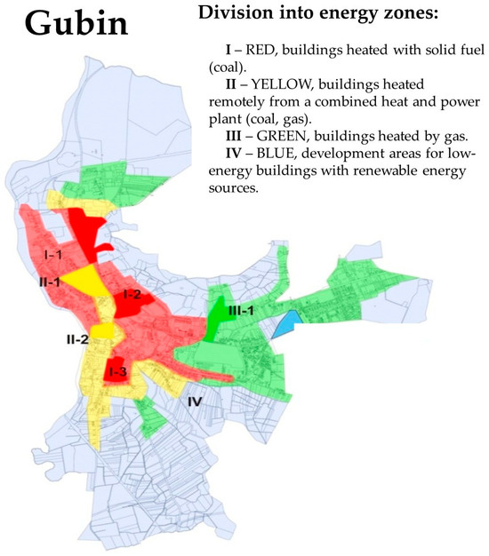 Based on empirical data, the built-up areas of Gubin were divided into four zones (SI–SIV) based on differences in environmental quality, which resulted from variations in technical condition, construction technology, main heat sources, and building typology. Zone SIV, which comprises low-energy buildings compliant with contemporary environmental standards, was excluded from the study.
