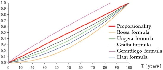 The foundation for assessing the technical condition of the analysed buildings with the lowest technical status (those located in zones I–III) is a calculation formula establishing the proportionality between the building’s age and its theoretical service life [] as visually represented in Figure 4 (the Szt formula is detailed below).