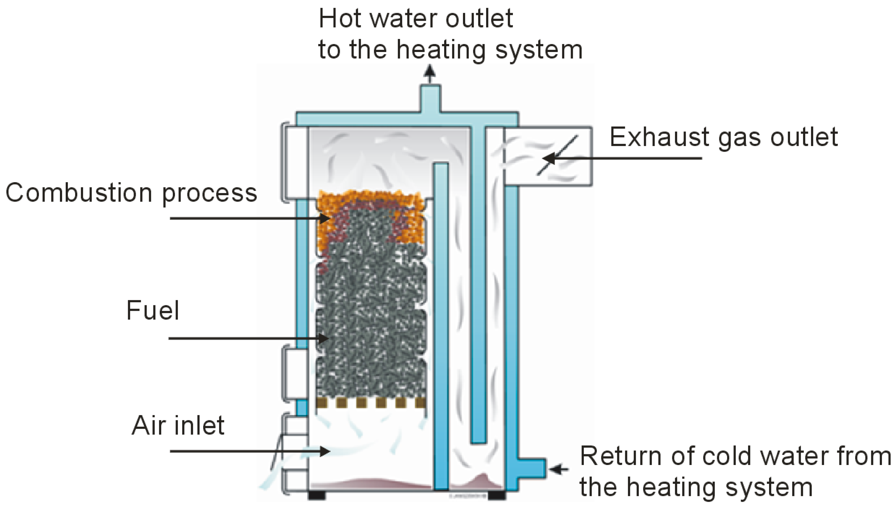 Hand-fired grate boilers are characterized by a simple design. They usually have a combustion chamber connected to the hopper and one or more combustion passages. Their efficiency reaches up to 87%, and the combustion time of a single fuel charge is up to 24 h [19,20]. In chamber boilers with manual fuel loading, the fuel is burned in the upper part of the fuel chamber, which is supplied with air. Flue gases are discharged to the heat exchanger directly from the upper part of the fuel bed. A view of the boiler is shown in Figure 2.