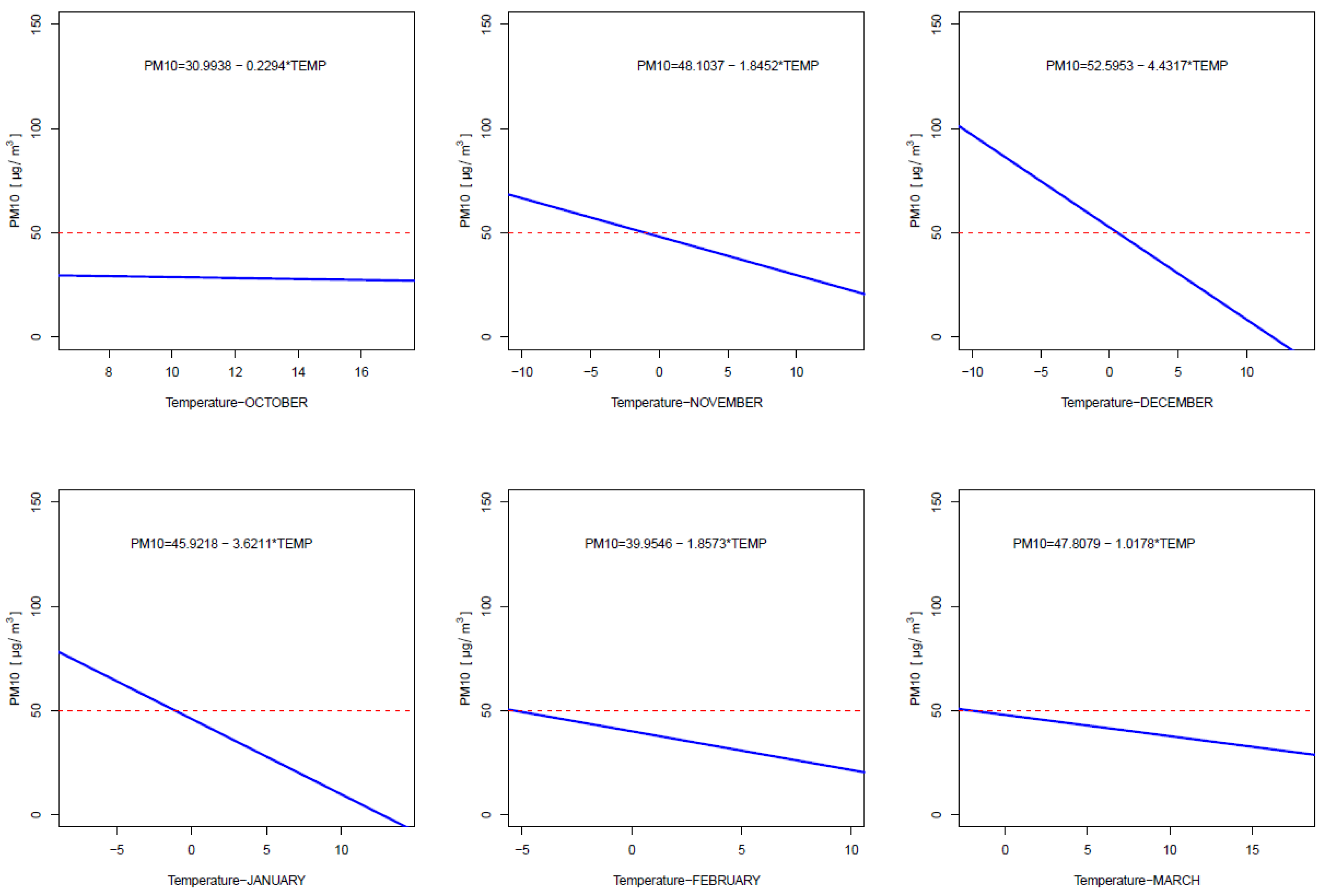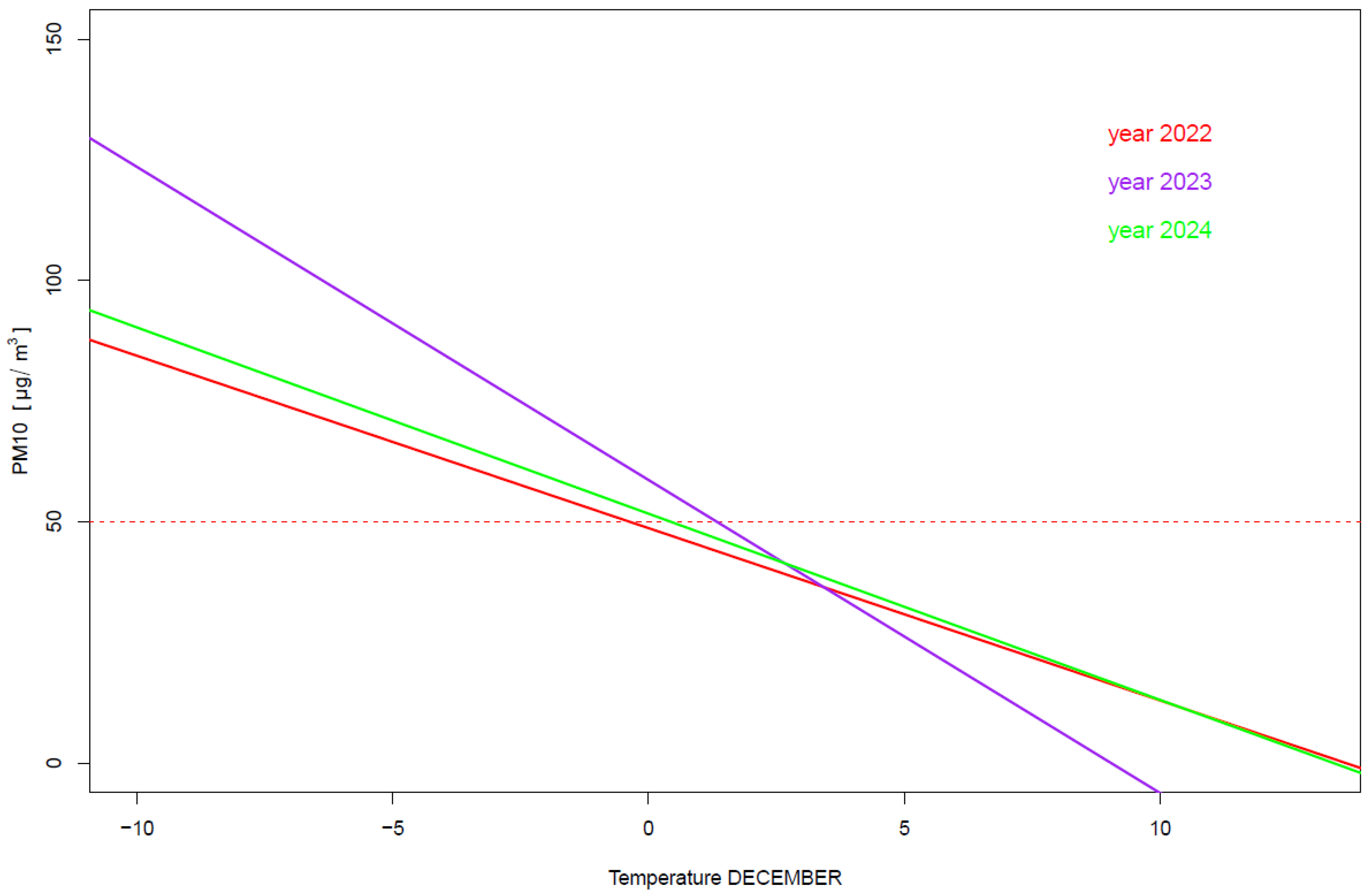 In Section 3.3, the correlation coefficients between PM10 values and temperature are determined separately for each month, and a mixed linear regression model is presented. An extension of this analysis, as well as a presentation of the simple regression models describing the PM10–temperature relationship for each month and each year separately, is included in Section 3.4. Furthermore, mixed linear regression models were estimated, which enabled the forecasting of monthly PM10 values in the future based on data from the years 2022–2024.