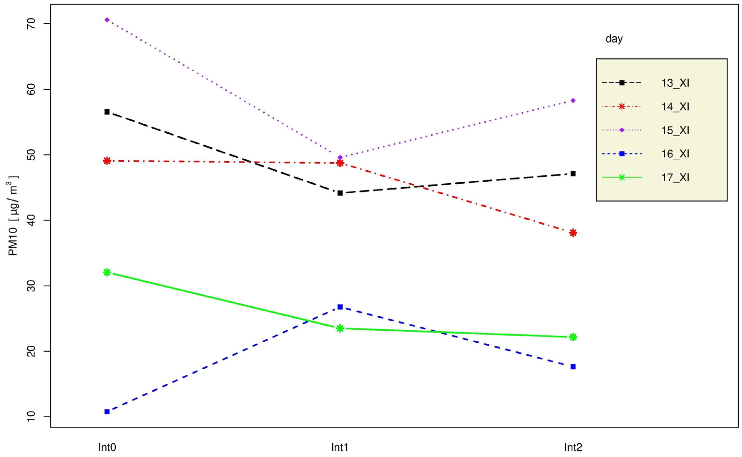 Table 4. p values for analysis of variance (comparisons of average PM10 contents) of three time intervals (ANOVA) for five sample days in November 2022.