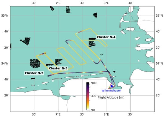 The flight paths in the North Sea are representative of the map shown in Figure 1, which depicts a flight path (Flight 23, 23 July 2020) in the regions of the clusters N-2, N-3, and N-4 in the German sector of the North Sea. They were flown downstream of the N-3 cluster (Gode Wind 1 and 2, Nordsee One), which, in turn, is downstream of the larger N-2 cluster (alpha ventus, Merkur, Trianel I and II, and Borkum Riffgrund I and II) at the time of the measurement campaign. Since the 2020–2021 flight campaign, further wind farms have been erected including the Kaskasi wind farm in the N-4 cluster. This particular flight strategy involved taking off from Wilhelmshaven airport in Northern Germany, conducting vertical profiling south of the wind farms, and rounding the N-3 cluster before flying legs orthogonal to the wind direction up to, and sometimes behind, the N-4 cluster (Meerwind Sud/Ost, Nordsee Ost, and Amrumbank West), and then returning to Wilhelmshaven airport. The vertical profiling, amounting to a rapid ascent and descent, adjacent to the flight legs, or up- and downstream of the clusters, was often performed at different positions to survey the vertical structure of the boundary layer.