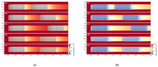 Spatial wind speed distribution from the FLORIS/Emeis model for (a) neutral and (b) stable conditions using the wind farm configuration reported by Stieren and Stevens [] (see their Figure 4). in their LES work, for two staggered wind farms separated by (a) 5 km, (b) 10 km, and (c) 15 km, two aligned wind farms separated by (d) 10 km, and (e) a staggered–aligned set-up separated by 10 km. Length and spanwise coordinates are normalized by the farm length and width, respectively.