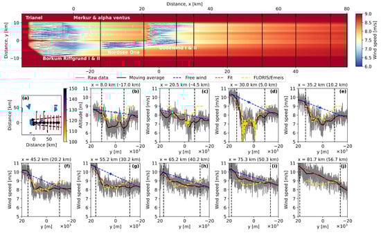 Flight 24 from N-2 (Trianel, Merkur, alpha ventus, and Borkum Riffgrund I and II) to N-3 (Nordsee One and Godewind I and II) and further downstream for wind speed  m/s and a wind direction of 270° in stable conditions. Top panel: the corresponding FLORIS/Emeis simulation for the Monin–Obukhov similarity parameter . The origins of the top and bottom x-axes are placed at the alpha ventus (top axis) and Godewind (bottom axis) wind farms. The vertical black lines are positioned at the location of the flight legs. The recorded wind speeds from these legs are plotted in the panels (b–j) below along with the wind speeds from the FLORIS/Emeis simulation. Panel (a) shows the individual legs colored according to altitude. The origin of the plot in panel (a) is located at the alpha ventus wind farm in cluster N-2. In panels (b–f), wind speeds are represented as grey (raw 100 Hz measurements), black (smoothed measurements), red dashed (Gaussian fit to the smoothed data), and yellow dashed (FLORIS/Emeis wind speeds). The dashed blue line is the assumed freestream wind speed estimated from wind speeds beyond the assumed wake width. The ‘wake length’ in this instance is interpreted as the recovery distance downstream from Godewind (bottom x-axis in the top panel).