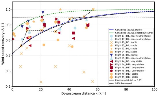 Wind speed recovery calculated by Equation (5) from the flights listed in Table 1. The dashed curves are the exponential fits used in Cañadillas et al. [] for flights of the 2016–2017 campaign. The Emeis analytical model (solid black line) is for stable conditions () and input parameters to match the stable Cañadillas et al. [] curve (blue dashed line). The horizontal dotted line corresponds to the assumed wind speed recovery of 95%. The dashed black line emphasises the track of the Flight 24, ID = 6 as shown above in Figure 3.
