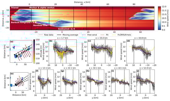 Flight 23 from N-2 to N-4 (ID = 4), and N-3 to further downstream (ID = 5), for freestream wind speeds  m/s and 11 m/s, respectively, and a wind direction of 240° in stable conditions. Top panel: the corresponding FLORIS/Emeis simulation for  m/s and . The vertical black lines are positioned at the flight legs whose recorded wind speeds are plotted in the panels below along with the results of the FLORIS/Emeis simulation. The x-coordinates along the top refer to the origin at N-2 (panels (a–d)) while the x-coordinates along the bottom refer to the origin at N-3. Panels (a,e) show the individual legs coloured according to altitude whose origin is at the Merkur and Godewind wind farms in clusters N-2 and N-3, respectively. In panels (b–d,f–j), wind speeds are represented as grey (raw 100 Hz measurements), black (smoothed measurements), red (Gaussian fit to the smoothed data), and yellow (FLORIS/Emeis wind speeds). The blue line is the assumed freestream wind speed estimated from wind speeds beyond the assumed wake width. Panels (b–d,f–j) correspond to the origin at cluster N-2 and N-3, respectively. For example, panel (d) ( km) shows wind speeds to the left of panel (f) ( km) when looking downstream.