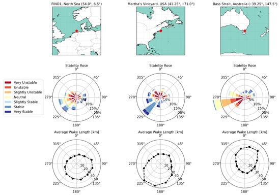 Maps showing the locations of FINO1, Martha’s Vineyard, and Bass Strait (top), stability roses (middle) formed from offshore ERA5 data for the year 2024, and corresponding polar plots (bottom) of average wake lengths at the corresponding locations.