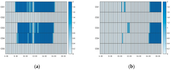 In Case 2, the electric bus charging and discharging patterns are shown in Figure 7. Between 9:00 and 16:00, approximately two buses charge at each of CS1, CS3, and CS4, which improves the high-voltage issues in both substations. From 16:00 to 18:00, two buses discharge at each of the stations, alleviating low-voltage issues. However, due to the limited power capacity of the AC charging stations, the voltage improvement is relatively weak. The total network loss decreases significantly by approximately 23.25%.