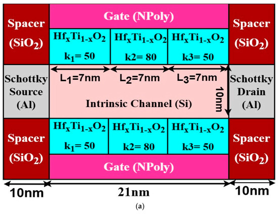 Using the COGENDA TCAD simulator, the following devices with a channel length of 21 nm were created: (1) ‘Device-I’, i.e., an N-Channel HD-SM-GAA MOSFET (radius 5 nm); (2) ‘Device-II’, i.e., a P-Channel HD-SM-GAA MOSFET of 5 nm radius; and (3) ‘Device-III’, i.e., a P-Channel HD-SM-GAA MOSFET of 8 nm radius. The design specifications used for the proposed structures are shown in Table 1. The design parameters of GAA transistors were selected according to Intel dimensions [23]. Figure 1 shows the 2D structures of the proposed devices (a) ‘Device-I’ and (b) ‘Device-II’ of 5 nm radius, 21 nm channel length (L1 = 7 nm + L2 = 7 nm + L3 = 7 nm), and tunable compound (high-k) gate dielectric HfxTi1−xO2 material (k1 = 50, k2 = 80, and k3 = 50). The amalgamation of two oxide materials (HfO2 and TiO2) was chosen to increase the permittivity value to greater than 50. The potential of an insulator is increased by a greater dielectric constant value. Chemical vapor deposition (CVD) is often used to deposit the chosen compound dielectric material, such as HfxTi1−xO2 film, on silicon at temperatures as high as 1000 °C. Unwavering coverage over intricate layouts and fast, flexible growth rates are two benefits of the CVD process [24]. Leakage current and static power consumption are greatly reduced using the high-k gate dielectric because it increases gate capacitance in the structure [22]. Schottky source/drain regions made with aluminum metal and spacer regions and developed with silicon dioxide (SiO2) provide low parasitic effects in proposed devices [25,26].