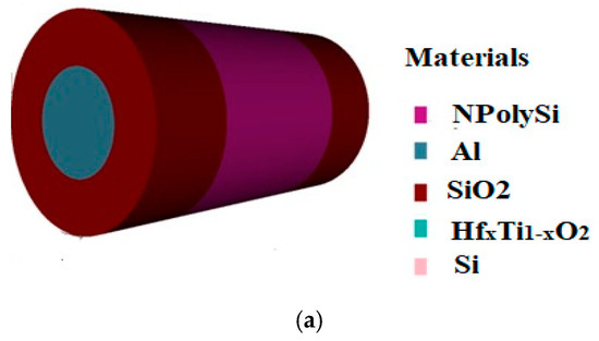 However, the performance, layout, and cost of FinFETs are now quite problematic, making future scaling of the transistors a tedious operation necessitating unique architectural designs. This is a barrier to their application in smart cities, where size/density, energy footprint, and development times and costs are critical. Without a doubt, among the many device structures employed, the ultimate scaled transistor structure GAA has shown promise for designing nano-scale devices because it provides electrostatic controllability by completely controlling the channel’s carriers via the gate with immunity to short channel effects and high current drivability, providing higher chip-packing density because of the perfectly circular configuration, negligible corner effects, huge transconductance, and a desirable sub-threshold slope [9,10,11]. Shorter channel lengths produce faster operating speeds and more components per chip [12]. A noteworthy property of GAA transistors is that their speed improves, and their cost drops as their size shrinks, driving the rapid expansion of the electronic technology sector [13]. According to IBM, a 150 mm2 device with a compact architecture employing GAAFET 2 nm technology may fit 50 billion transistors [14]. Due to the improved channel transport control provided entirely by the surrounding gates in GAAFETs, FinFETs are likely to be phased out in future technological nodes. In order to continue logical growth beyond the 5 nm technology node and beyond FinFETs, the industry has widely embraced GAAFETs, a novel next-generation transistor device [15]. The exceptional gate control and decrease in SCEs have also greatly improved the performance of analog and radio frequency (RF) devices [16]. However, the main disadvantage of these massively scaled devices is elevated series resistance as a result of the origination of unanticipated source/drain intersections. These shortcomings have led to the replacement of doped source/drain regions with novel approaches like the Schottky barrier/contact source and drain, enabling a greater ON-current and enhanced transconductance. Moreover, not only do Schottky barrier metal-oxide semiconductors have drain and source divisions made of aluminum that are likely to find numerous applications in deep micron-sized devices, but they also offer advantages in terms of cultivation [11]. To enhance these devices’ capabilities, many engineering approaches, such as bandgap engineering with hetero-junction devices and gate and work function engineering, have been investigated in the literature work [17]. High-k gate dielectric material such as HfxTi1−xO2 with a permittivity value above 40 has been preferred for sub-22 nm multi-gate FinFET devices. It allows the controllability of electrostatics and creates an effective link between the gate and the channel, which helps to reduce leakage current and other problems like SCEs [9]. Major semiconductor companies, including Intel, IBM, Samsung, and TSMC, have started employing high-k gate oxide and metallic gate materials in the manufacture of transistors for scaled devices [18,19,20,21]. The key characteristics of high-k gate dielectric include a high-energy bandgap and thermal and chemical stability with silicon and high crystallization temperatures [22].