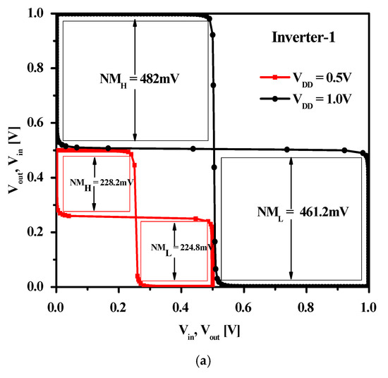 The lowest output value at logic level 0 is represented by VOL, and the highest output voltage at logic level 1 is represented by VOH [38]. Logic value 0 designates the lowest input voltage (VIL), while logic value 1 designates the highest input voltage (VIH). Figure 15 demonstrates the butterfly curve of Inverter-1 and Inverter-2 at supply voltage levels of 0.5 V and 1.0 V. The calculated noise margin values, i.e., NMH = 482 mV and NML = 461.2 mV of Inverter-1, are demonstrated in Figure 15a. Figure 15b displays the NM values for Inverter-2. The lowest output value at logic level 0 is represented by VOL, and the highest output voltage at logic level 1 is represented by VOH [38]. Logic value 0 designates the lowest input voltage (VIL), while logic value 1 designates the highest input voltage (VIH). Figure 15 demonstrates the butterfly curve of Inverter-1 and Inverter-2 at supply voltage levels of 0.5 V and 1.0 V. The calculated noise margin values, i.e., NMH = 482 mV and NML = 461.2 mV of Inverter-1, are demonstrated in Figure 15a. Figure 15b displays the NM values for Inverter-2. Inverter-2 has a 1.78% higher NMH compared to the NMH of Inverter-1 at 1.0 V, and a similar scenario was observed at 0.5 V, i.e., Inverter-2 had 11.85% more NMH compared to Inverter-1. Inverter-1 presents a larger value of NML at both voltages compared to Inverter-2, as shown in Figure 15. The butterfly curves and calculated NM values for the variable voltage VDD from 0.2 V to 1.0 V of the proposed inverters are displayed in Figure 16 and Figure 17, respectively. It has been analyzed in both inverters that a higher supply voltage results in a higher NM.