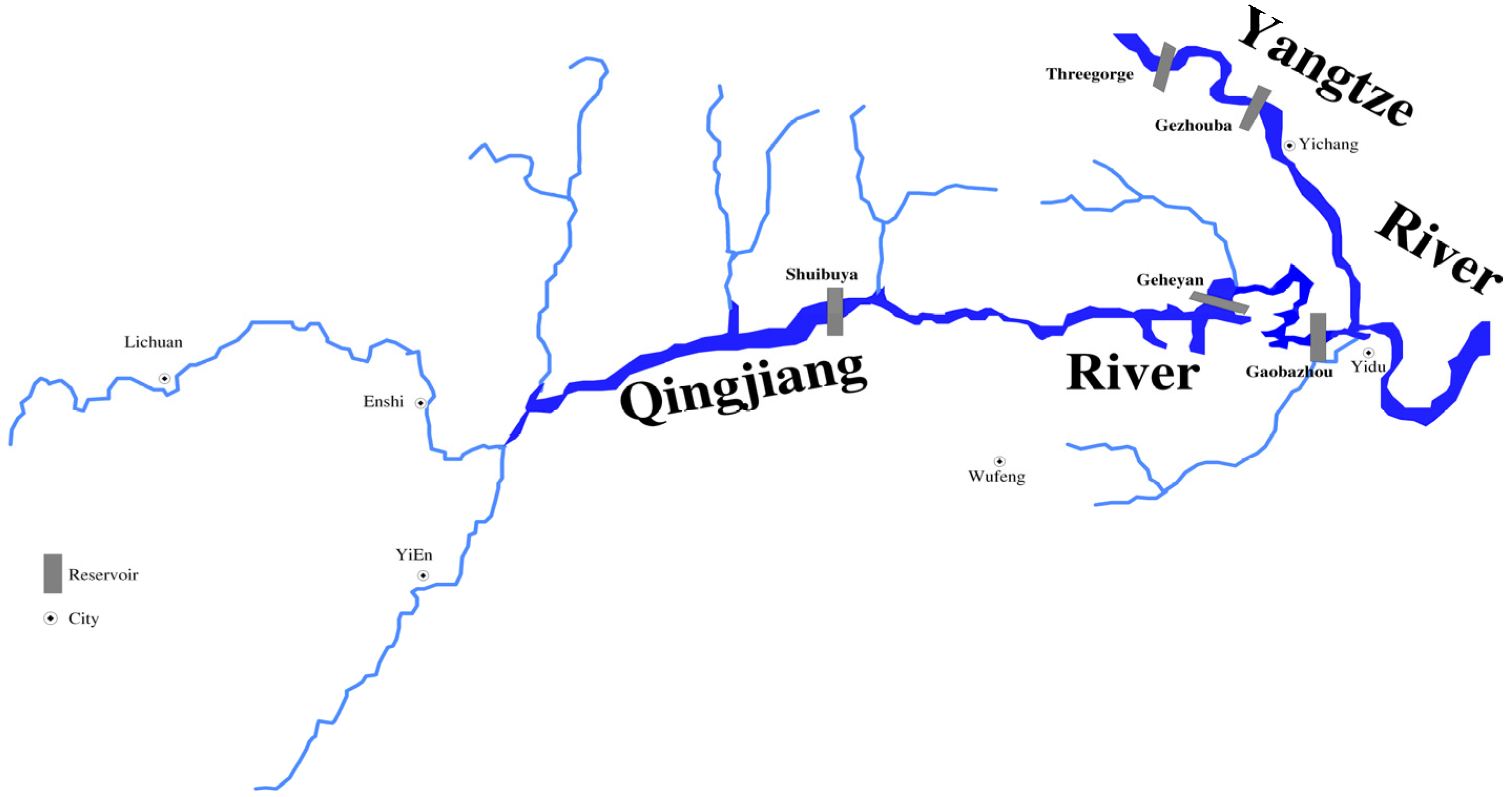 The multi-reservoir system of the Qingjiang cascades (consisting of the Shuibuya, Geheyan, and Gaobazhou reservoirs) and Three Gorges cascades (consisting of the Three Gorge and Gezhouba reservoirs), located at the middle part of Yangtze river in Hubei province of China, as shown in Figure 5, is the largest reservoir project system ever built in China till now. It is of great importance in relieving flood disaster and supplying clean energy, where it has the most typical structure as a complex and diverse system (i.e., it has various of regulation abilities, operational targets and districts coverage of energy supplying). Hence it is a representative case to explore its potential in power generation through optimal operation.