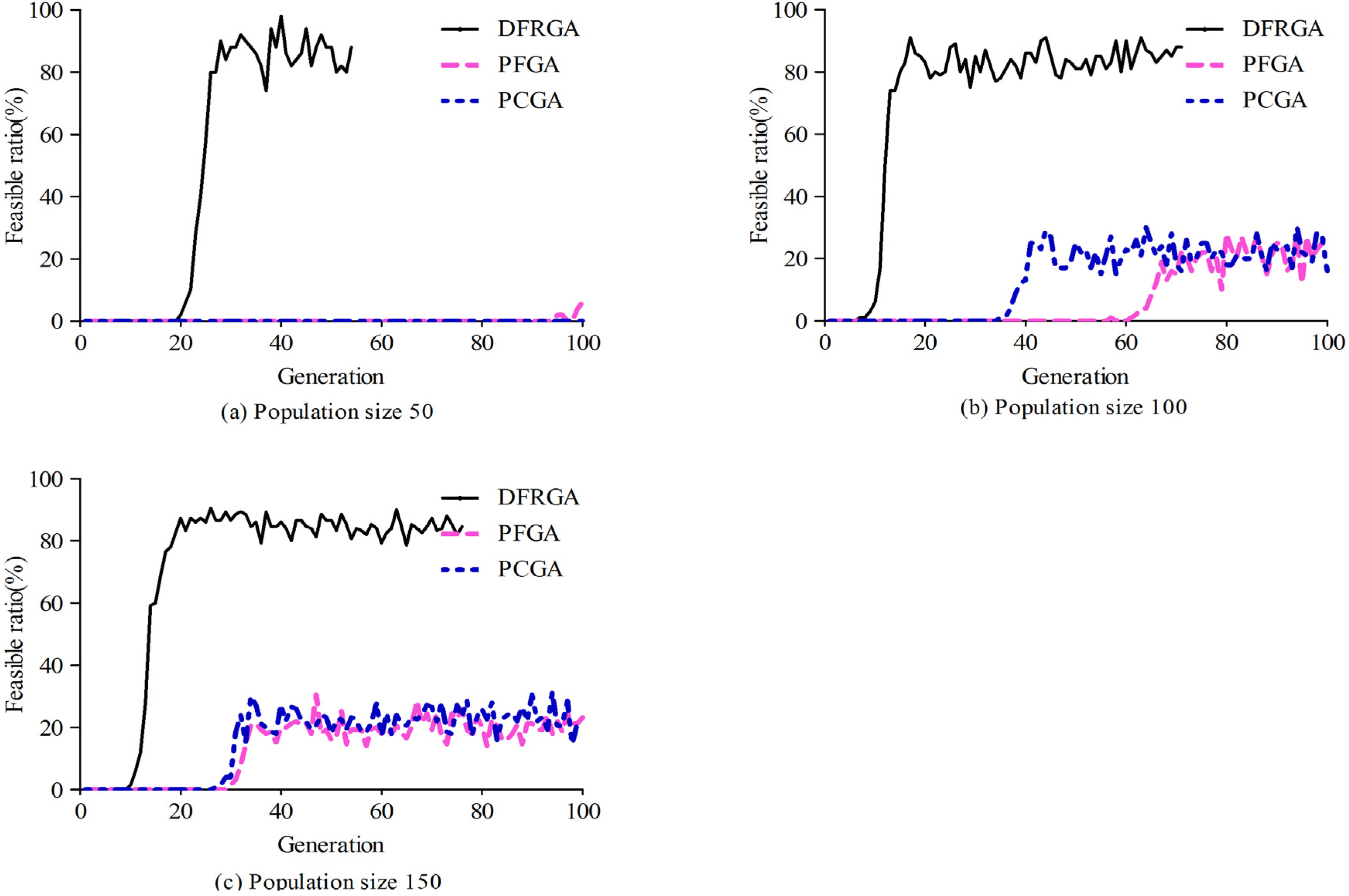 (3) DFRGA has superior performance in breeding feasible chromosomes which validates the effectiveness of the core improvement. As Figure 6 shows, after several generations’ evolution (about 20), DFRGA can reach a higher ratio of feasible chromosomes compared with the other two schemes, and keep a high level of enduring proportion. In contrast, PFGA and PCGA are so inferior in breeding feasible chromosomes and they may terminate in infeasible solutions when chromosome size is small. Besides, these two schemes must evolve at least 30 generations to provide a feasible proportion of no more than 30%.