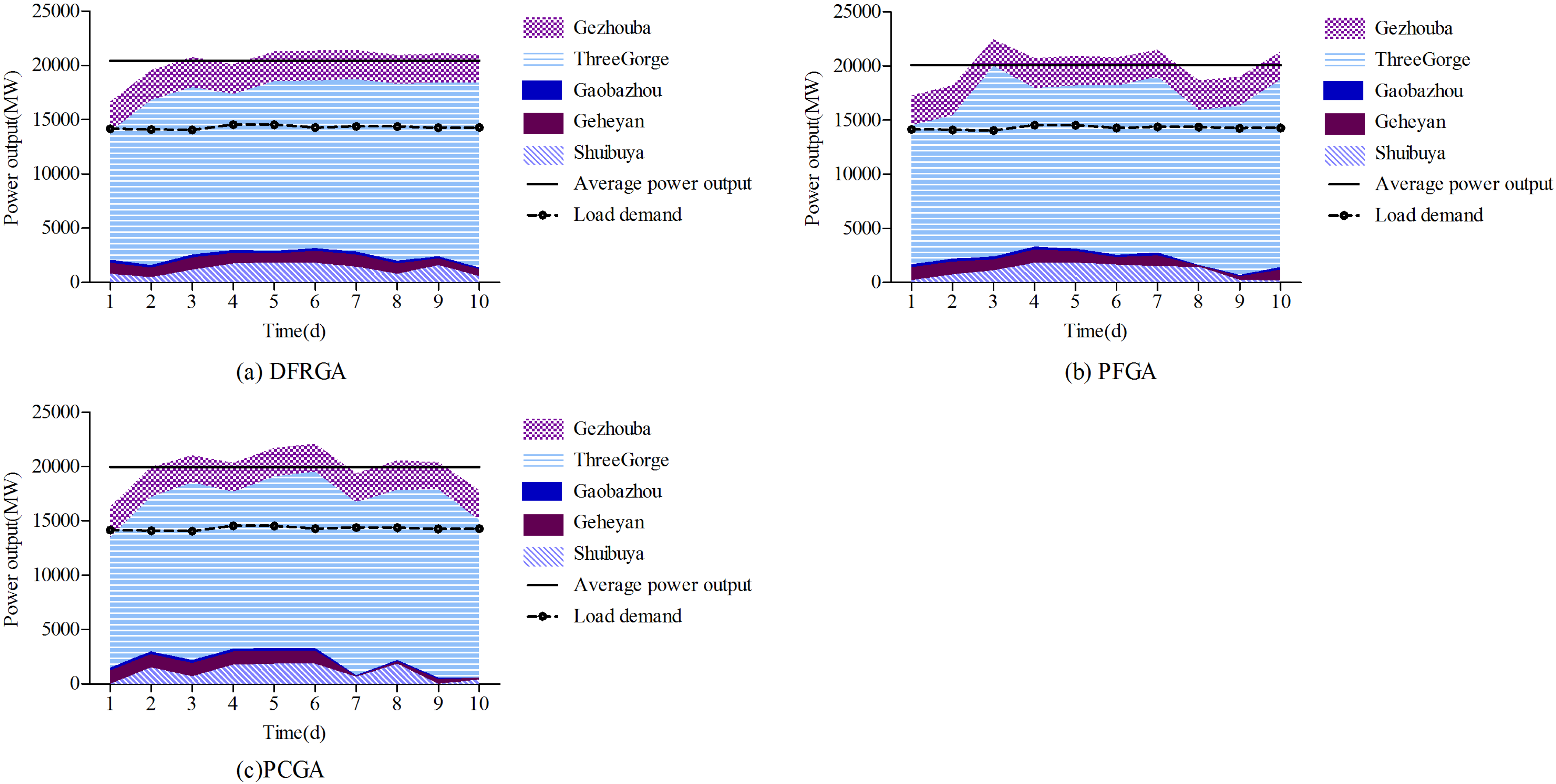 Figure 7 demonstrates that the DFRGA has achieved the largest average power output in the planning horizon among the schemes, and reached the largest objective function. Meanwhile, the DFRGA has attained a most uniform power output process which reflects the effectiveness of joint operation in a multi-reservoir system.