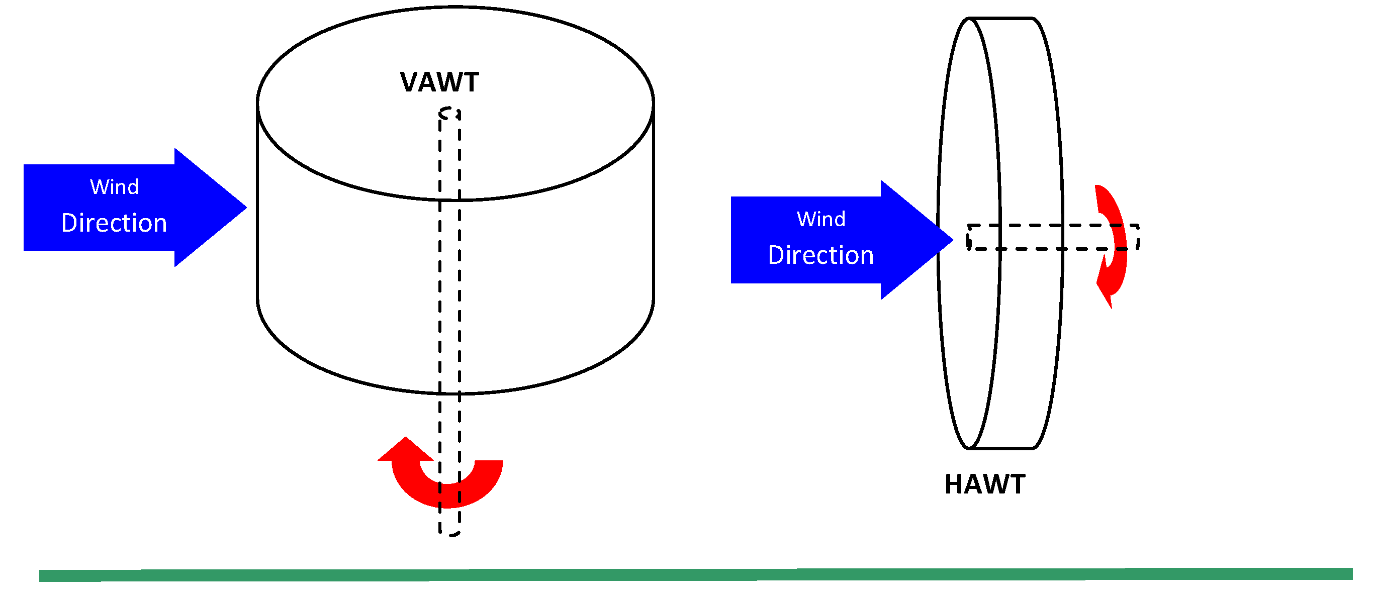 The orientation of the shaft and rotational axis determines the first classification of the wind turbine. A turbine with a shaft mounted horizontally parallel to the ground is known as a horizontal axis wind turbine or (HAWT). A vertical axis wind turbine (VAWT) has its shaft normal to the ground (Figure 1).