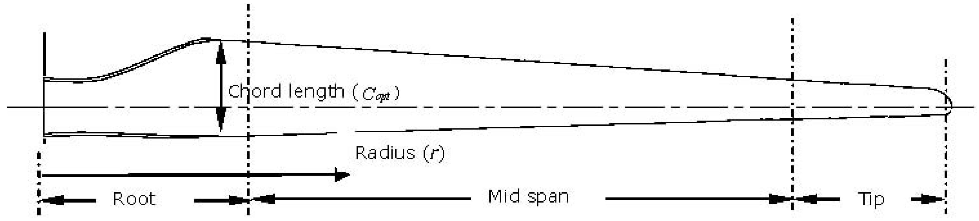 The ideal plan form of a HAWT rotor blade is defined using the BEM method by calculating the chord length according to Betz limit, local air velocities and aerofoil lift. Several theories exist for calculating the optimum chord length which range in complexity [1,4,10,12], with the simplest theory based on the Betz optimisation [Equation (3)] [1]. For blades with tip speed ratios of six to nine utilising aerofoil sections with negligible drag and tip losses, Betz’s momentum theory gives a good approximation [1]. In instances of low tip speeds, high drag aerofoil sections and blade sections around the hub, this method could be considered inaccurate. In such cases, wake and drag losses should be accounted for [4,12]. The Betz method gives the basic shape of the modern wind turbine blade (Figure 2). However, in practice more advanced methods of optimization are often used [12,13,14].