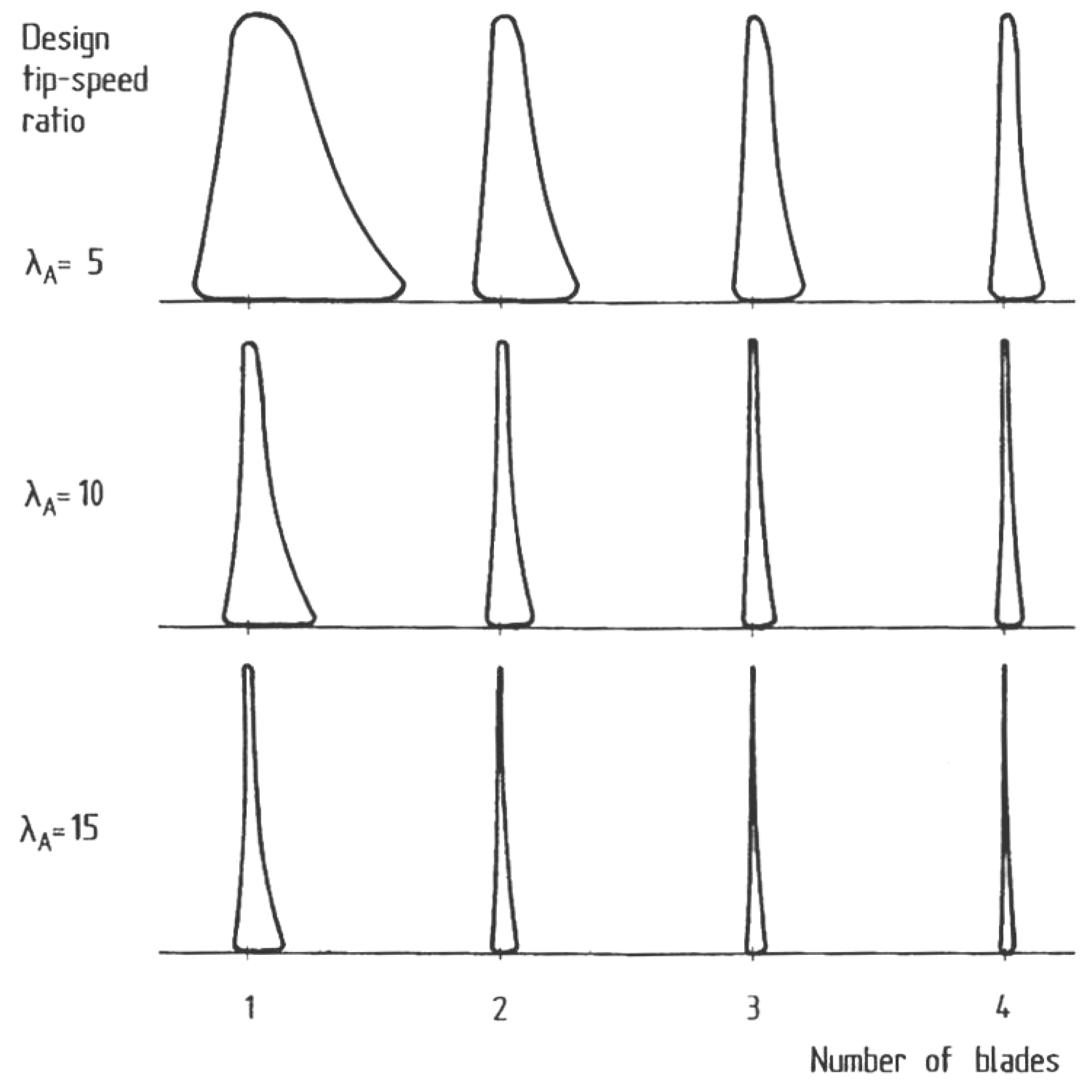 Optimal blade plan shape for alternate design tip speed ratios and number of blades [1].