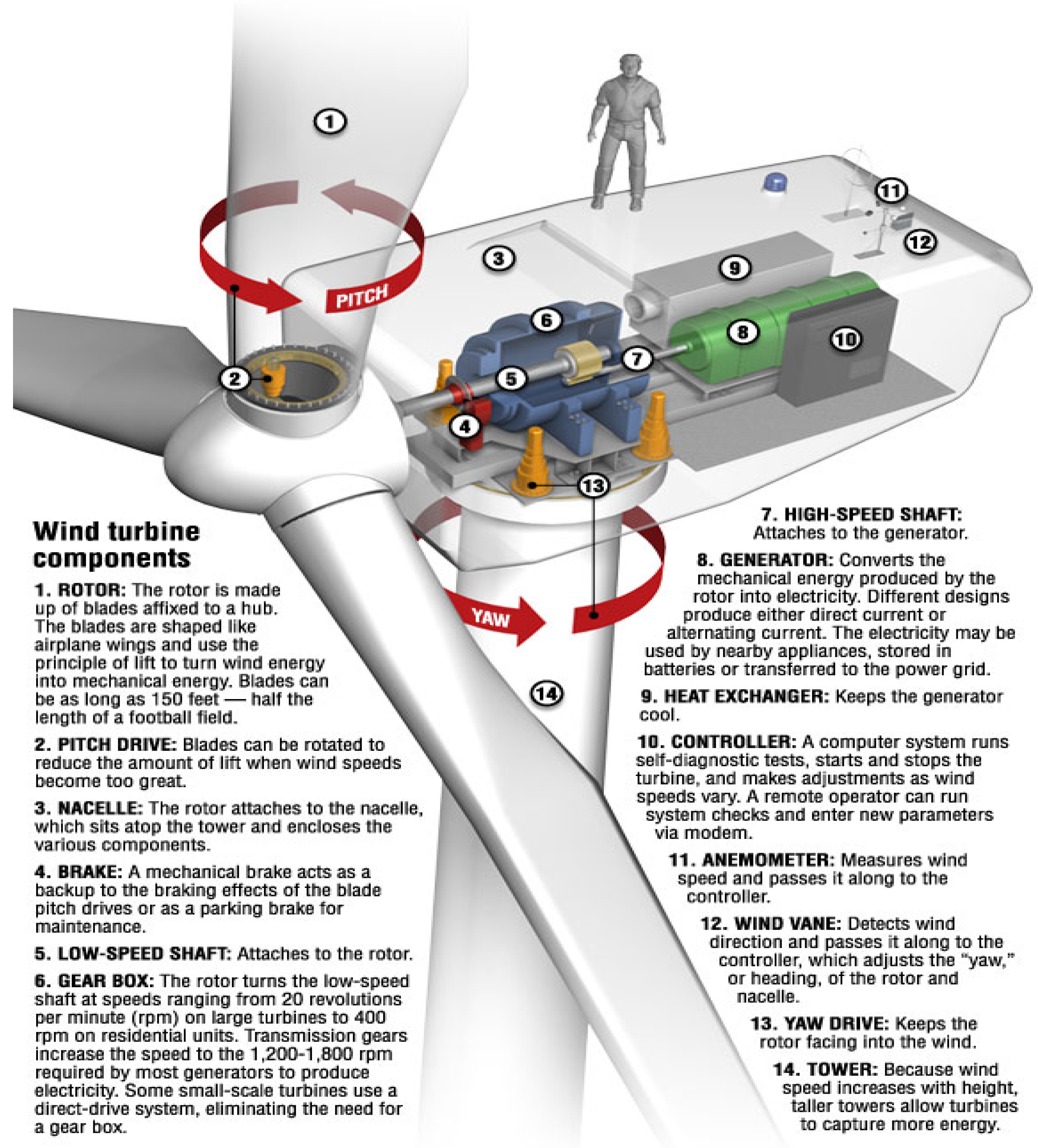 Typical configuration of a modern large scale wind turbine (www.desmoinesregister.com).