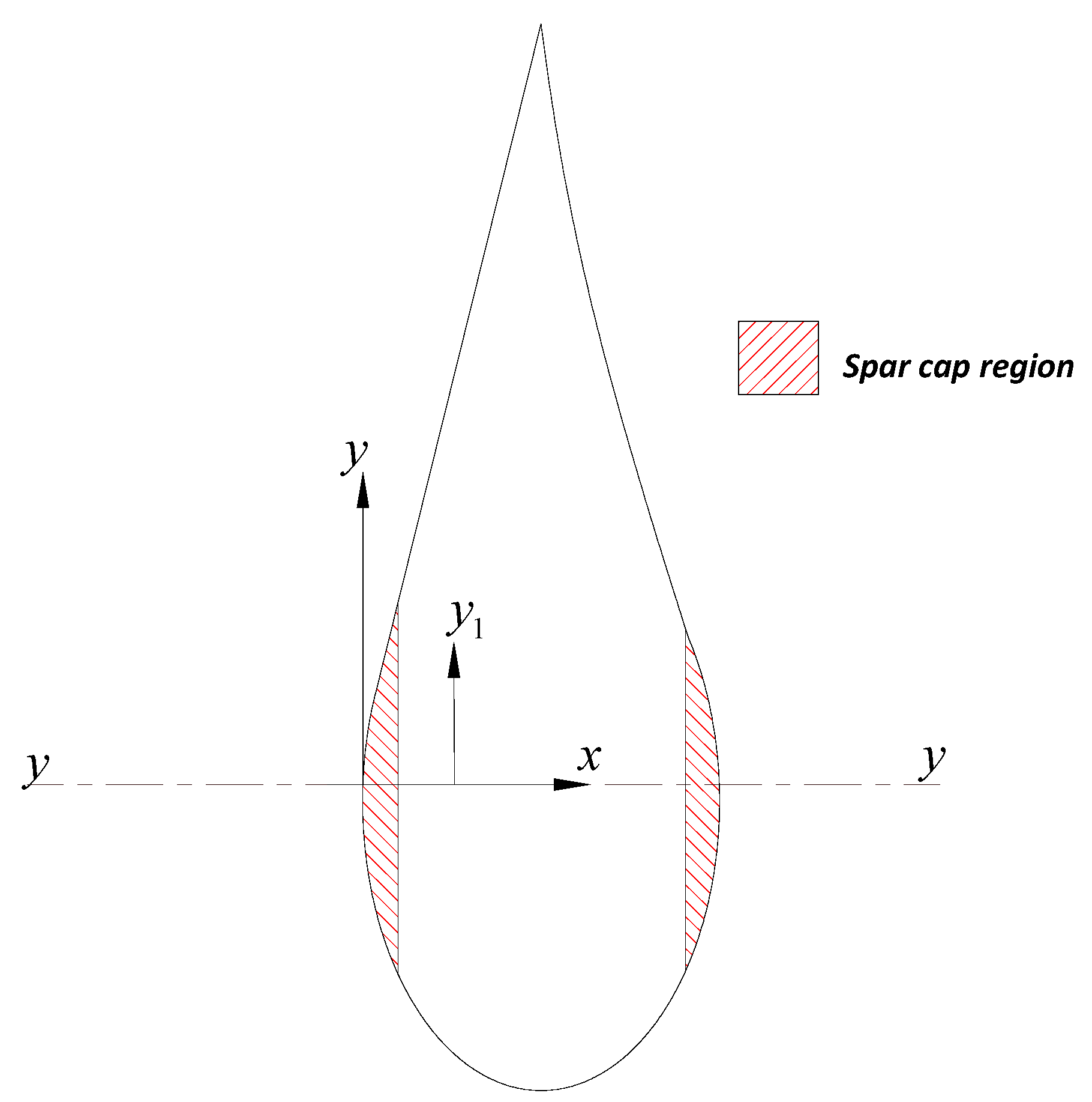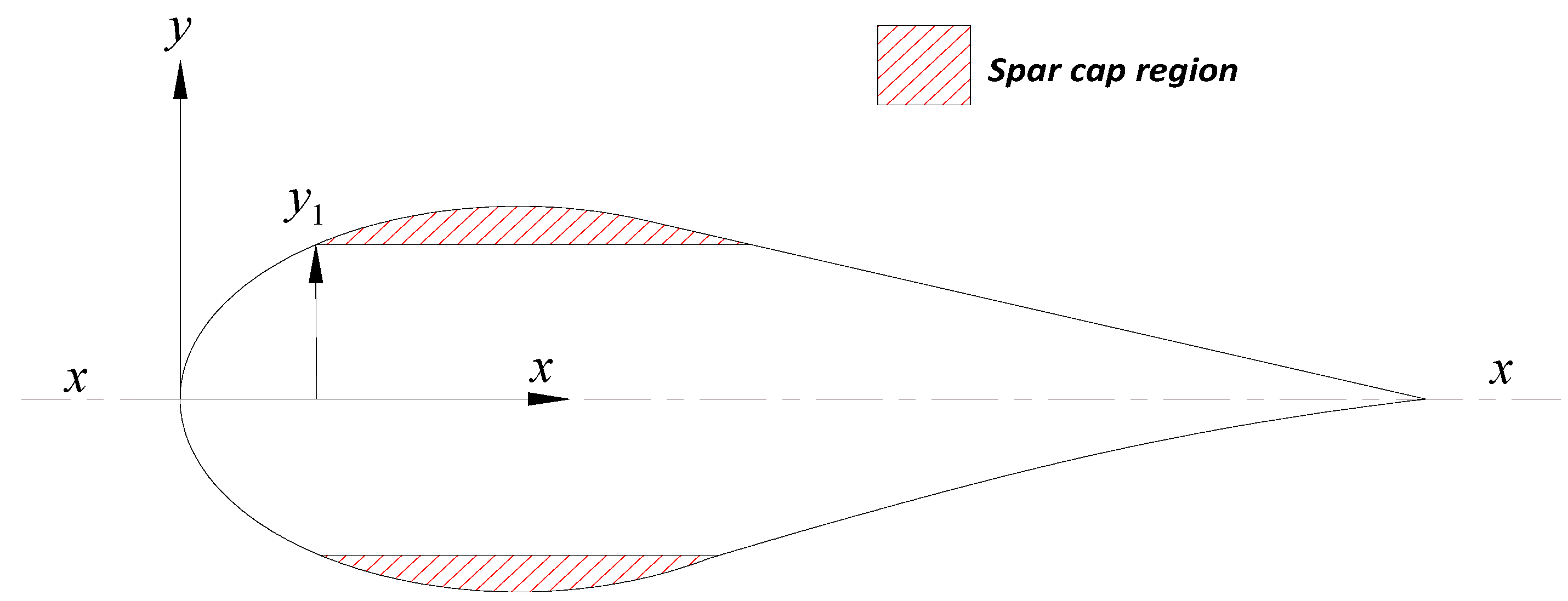 When calculating the second moment of area [Equation (5)] it is apparent that increasing the distance from the central axis of bending gives a cubic increase. When substituted into the beam bending equation [Equation (7)], it can be seen that a squared decrease in material stress can be obtained by simply moving load bearing material away from the central plane of bending. It is therefore efficient to place load bearing material in the spar cap region of the blade at extreme positions from the central plane of bending (x) (Figure 11). This signifies why thick section aerofoils are structurally preferred, despite their aerodynamic deficiencies. This increase in structural efficiency can be used to minimise the use of structural materials and allow significant weight reductions [42]. The conflict between slender aerofoils for aerodynamic efficiency and thicker aerofoils for structural integrity is therefore apparent. Bending moments [Equation (6)] and therefore stress [Equation (7)] can be seen to increase towards the rotor hub. This signifies why aerofoil sections tend to increase in thickness towards the hub to maintain structural integrity.