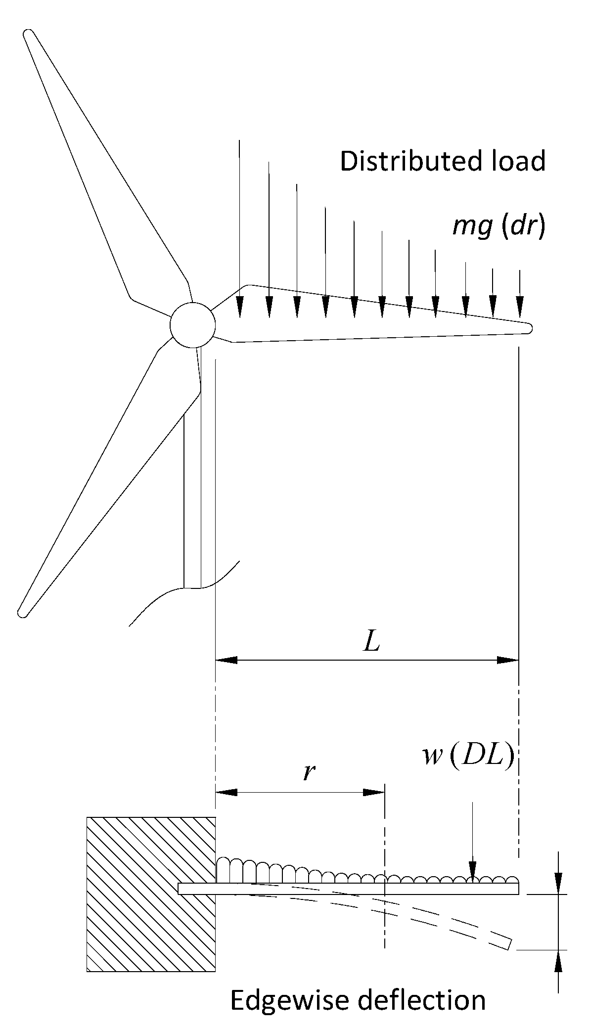 The blade modelled as a cantilever beam with uniformly distributed aerodynamic load.