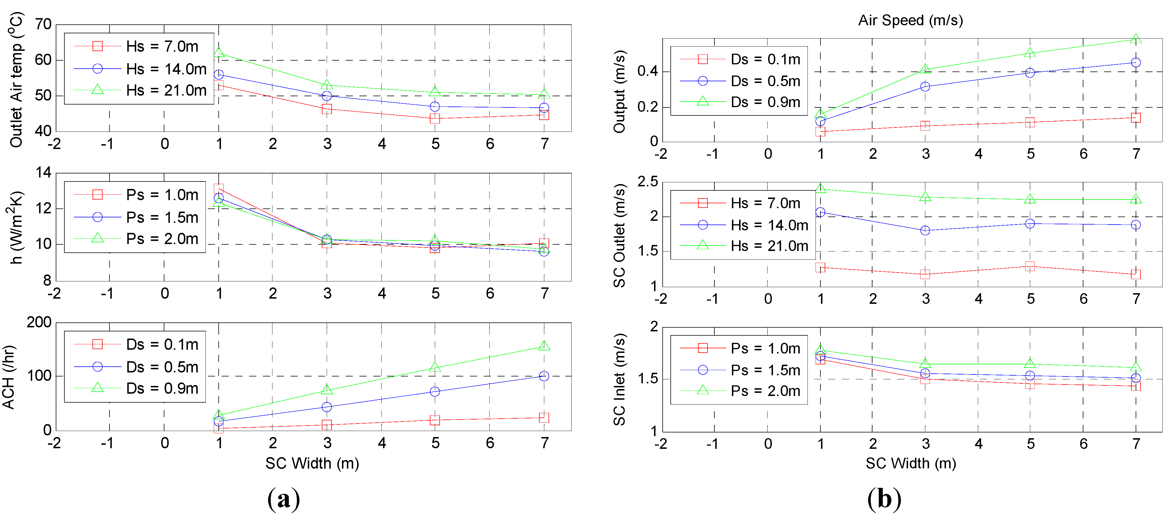 (a) Solar Chimney outlet air temperatures, heat transfer coefficients and air change rates with respect to varying solar chimney’s depth. (b) Output air speeds, solar chimney outlet air speeds and solar chimney inlet air speeds with respect to varying solar chimney’s depth.