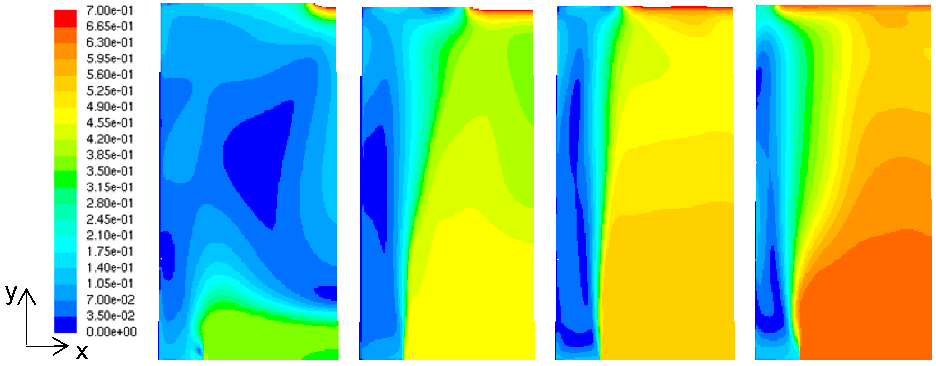 Output air speed distribution with respect to varying solar chimney’s width (left to right: 1.00, 3.00, 5.00 and 7.00 m) for solar chimney’s stack height of 14.0 m, depth of 0.50 m and middle inlet position.