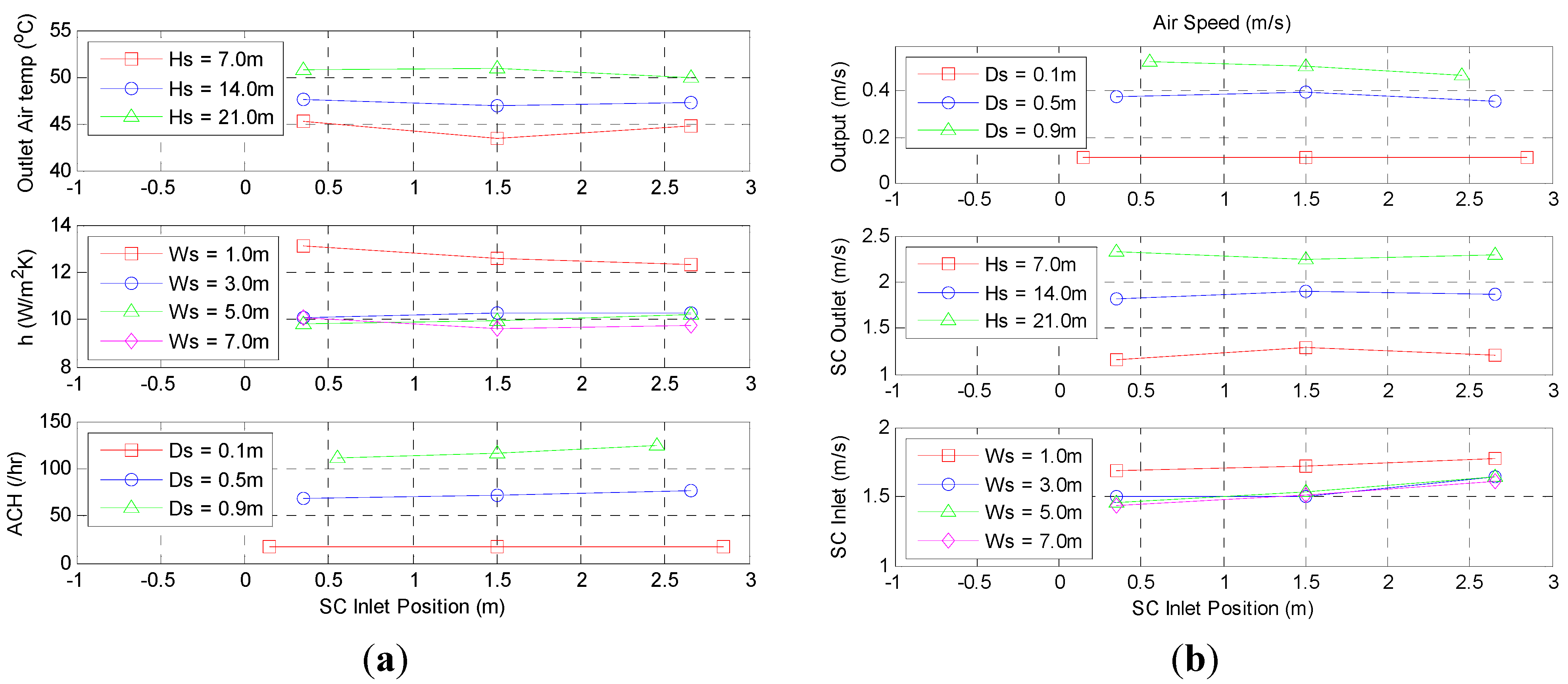 (a) Solar chimney outlet air temperatures, heat transfer coefficients and air change rates with respect to varying solar chimney’s inlet position; (b) Output air speeds, solar chimney outlet air speeds and solar chimney inlet air speeds with respect to varying solar chimney’s inlet position.