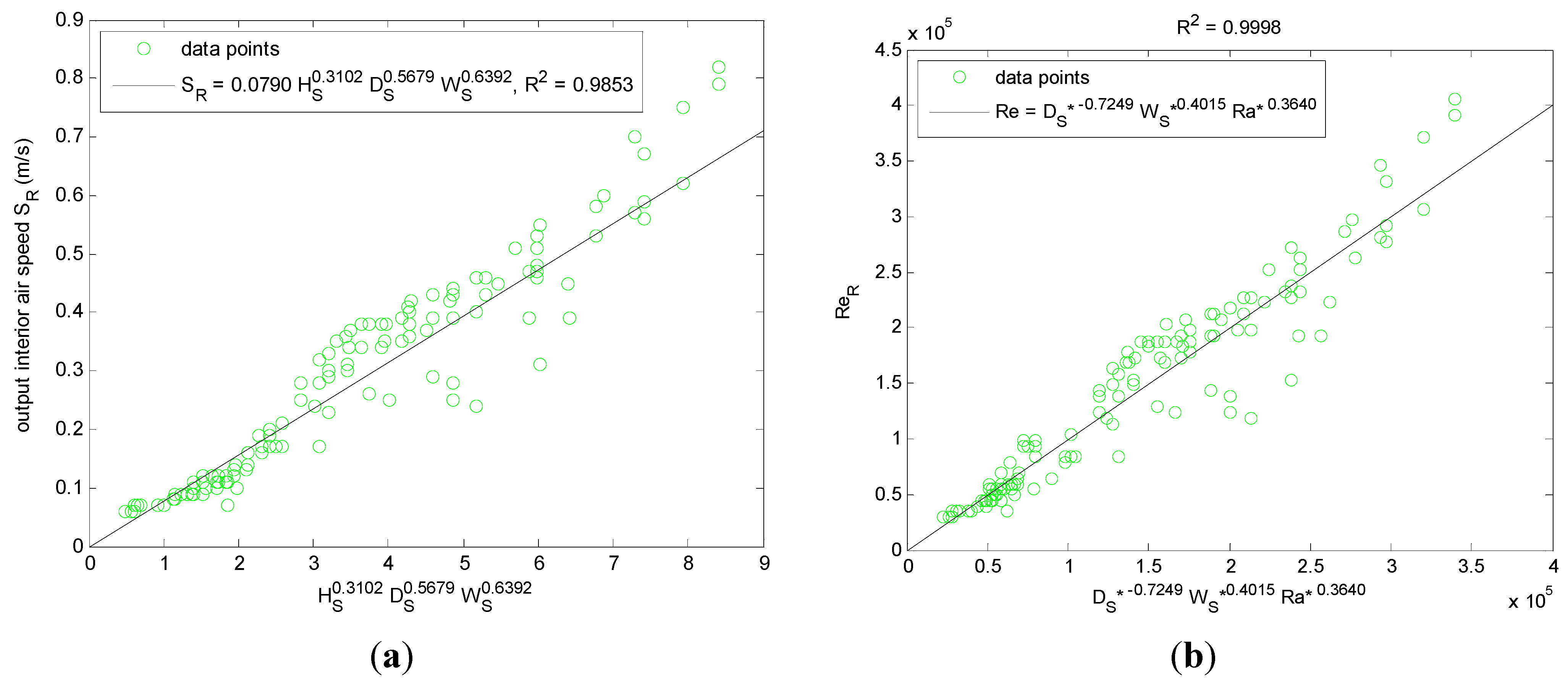 (a) Dimensional multiple linear regression model for output air speed; (b) Non-dimensional regression model for output Reynolds number.