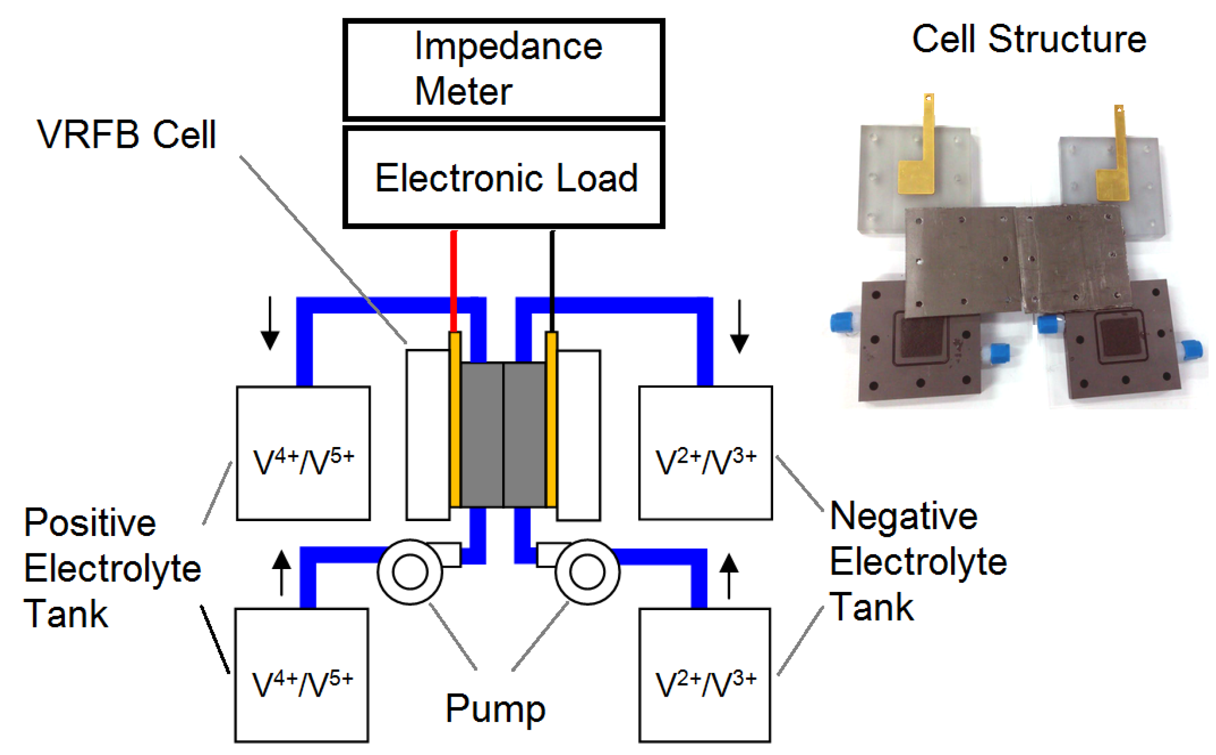 Figure 1 shows a schematic of the experimental setup, which consists of a VRFB cell, an electrolyte supplying system and a measurement system.