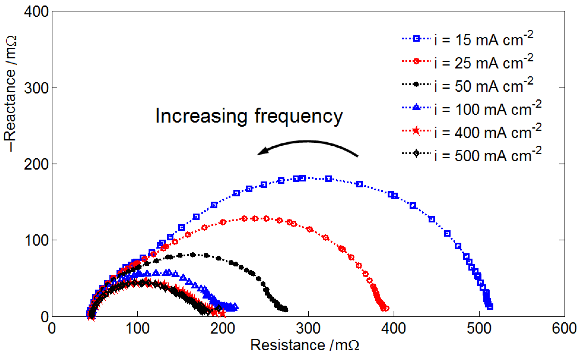 AC impedance plot of the VRFB operating at a stoichiometric ratio (SR) = 20, state of charge (SOC) = 60% and under various cell current density values.