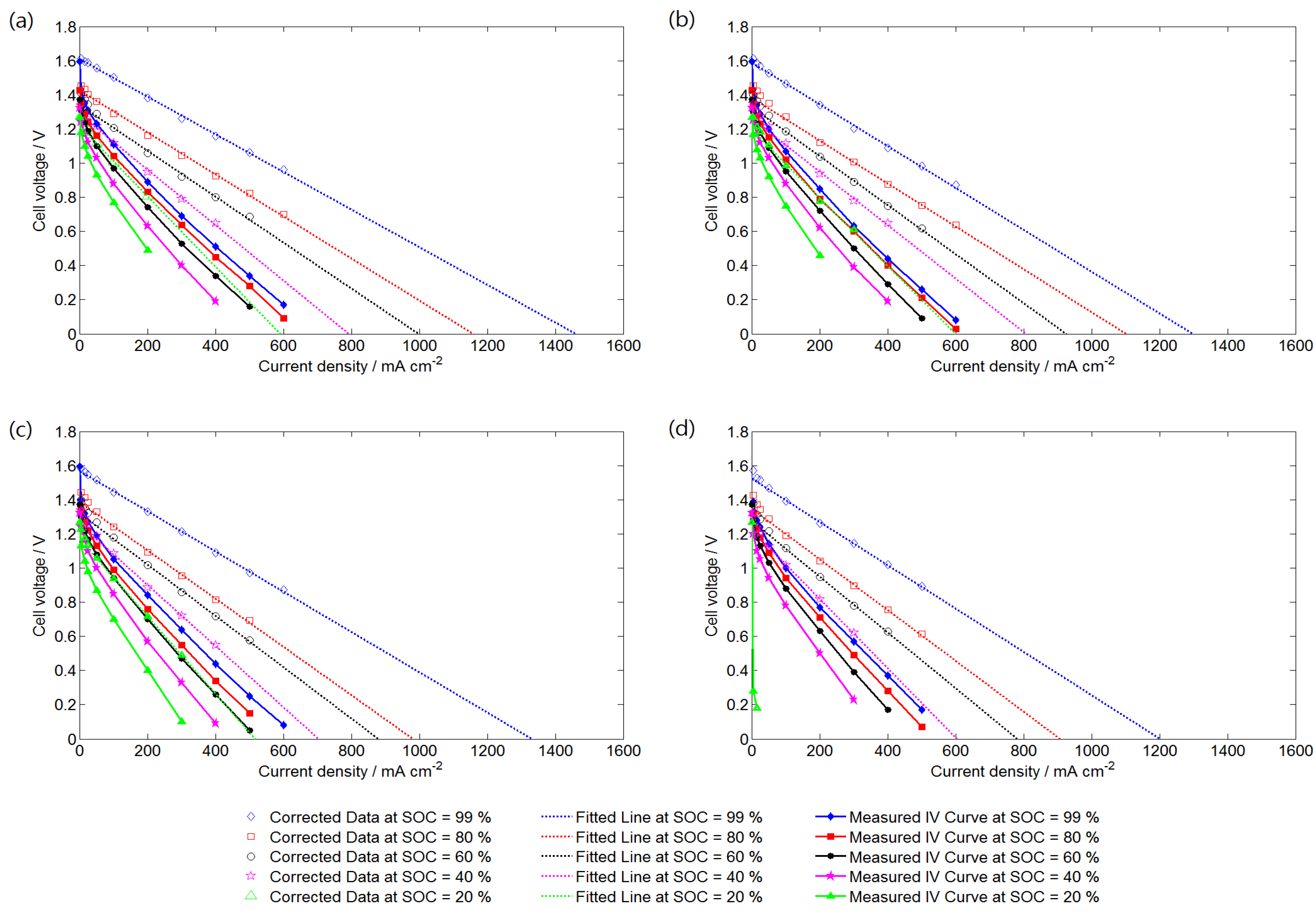 Measured polarization curves and corrected curves of the VRFB cell operating at different SRs: (a) SR = 20; (b) SR = 15; (c) SR = 10; and (d) SR = 5.
