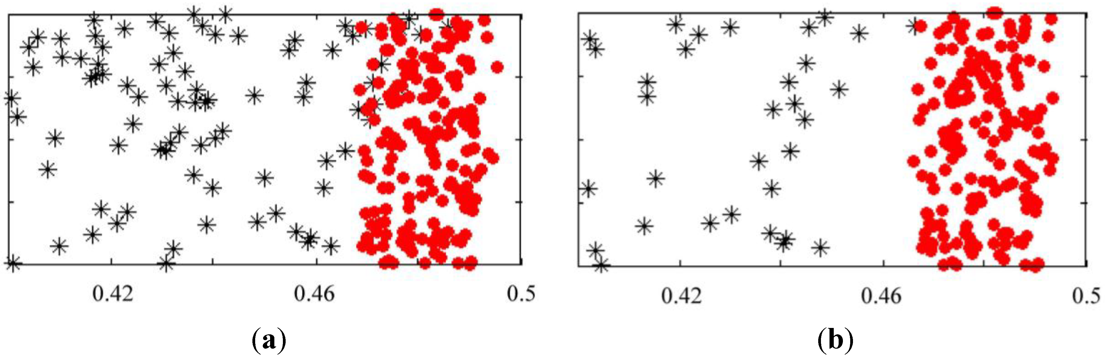 The acceleration coefficients and reflect the communication between the particles. A large leads to the particles relying on their own experience. As a result, the particles hover in the area near themselves. However, a large leads to all particles rapidly moving towards the best unit at present. In this case, the particles may converge on local best solution at the beginning of the algorithm. To balance the contradiction, and are usually set to be the same value. Nevertheless, this can’t satisfy the actual needs sometimes. For the purpose of having a larger and smaller at the beginning of the algorithm, decreasing and increasing , adjustment as follows is utilized: