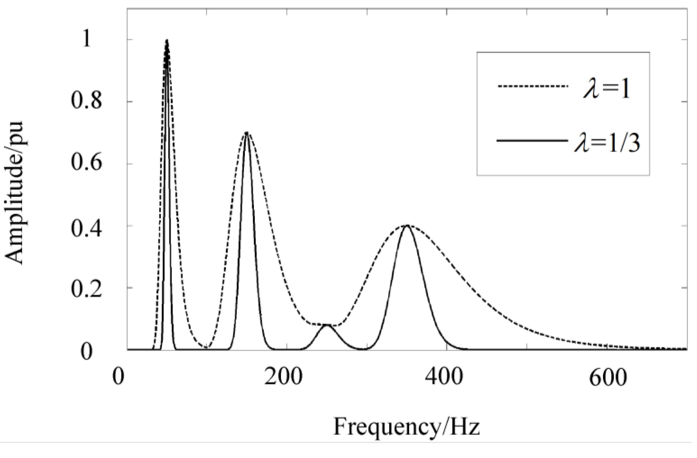 The window width in middle frequency area can be wider than GST so that the classification ability of the harmonic component can be improved to overcome the sidelobe effect. Using the same harmonic disturbance signal, Figure 2 shows the maximum spectrum amplitude curves with different width factors. As shown in Figure 2, the 5th harmonic, which can’t be recognized by traditional ST, can be recognized when the width factor is reduced suitably. Through the statistical experiments, the width factor is selected as ( represents of middle frequency).